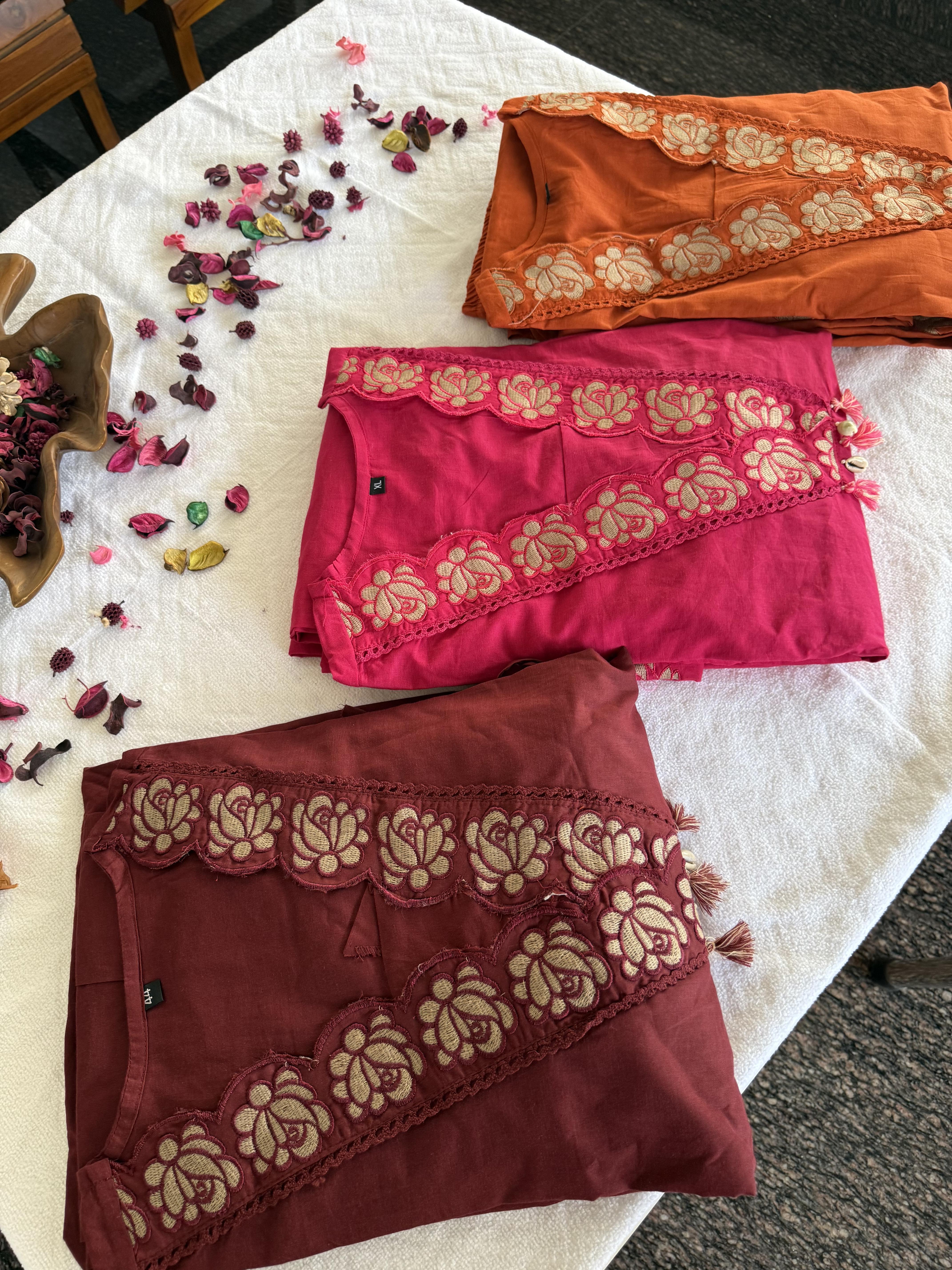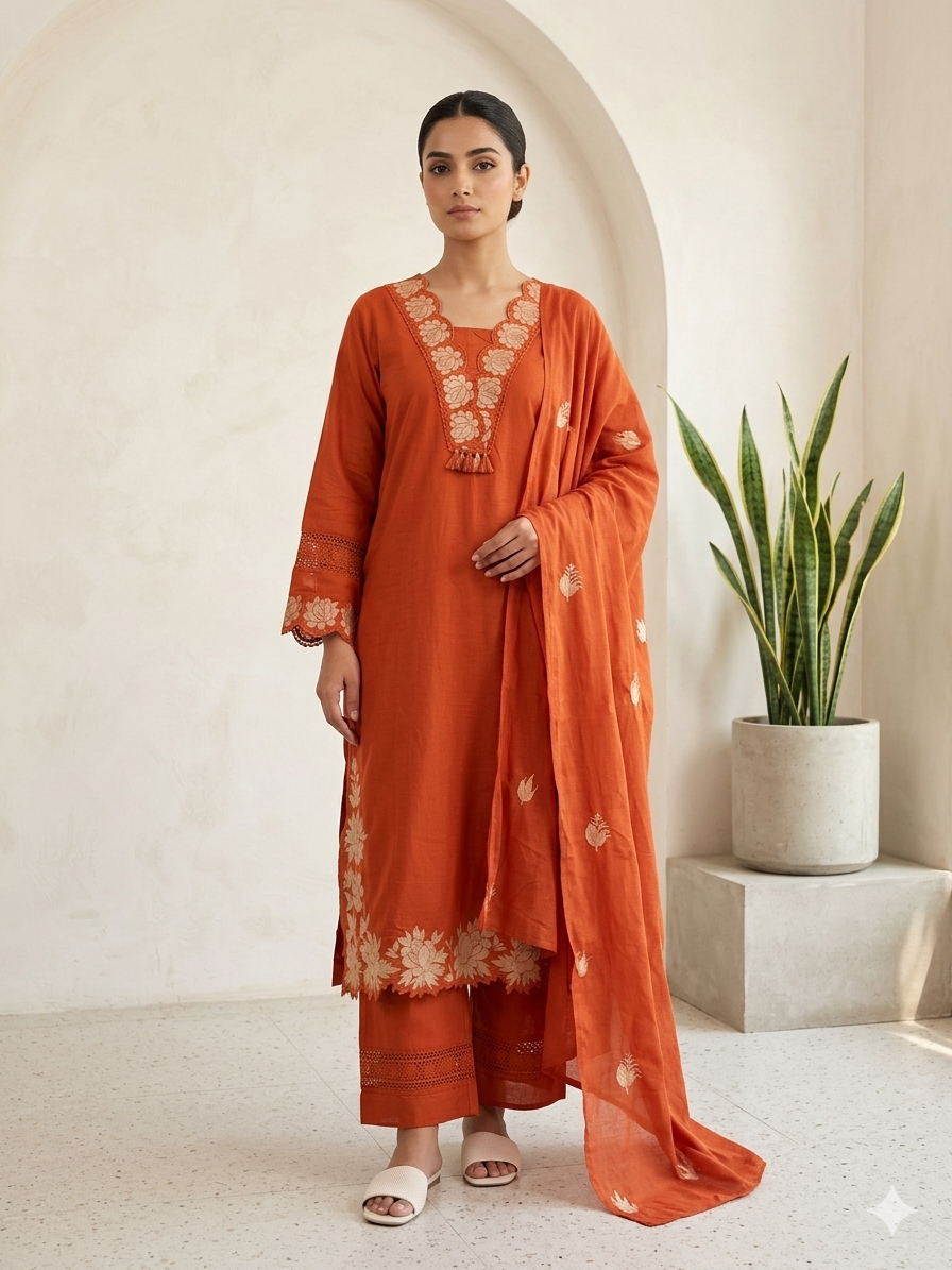 This elegant salwar set is crafted from soft cotton fabric, offering comfort and breathability for everyday wear. The design features rich brick orange tones with accents of magenta and maroon, creating a warm and vibrant look.