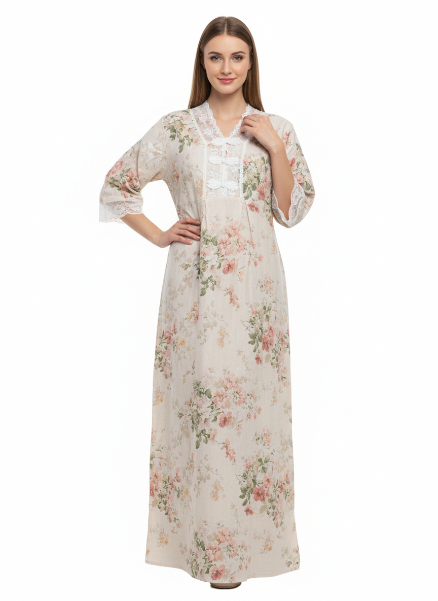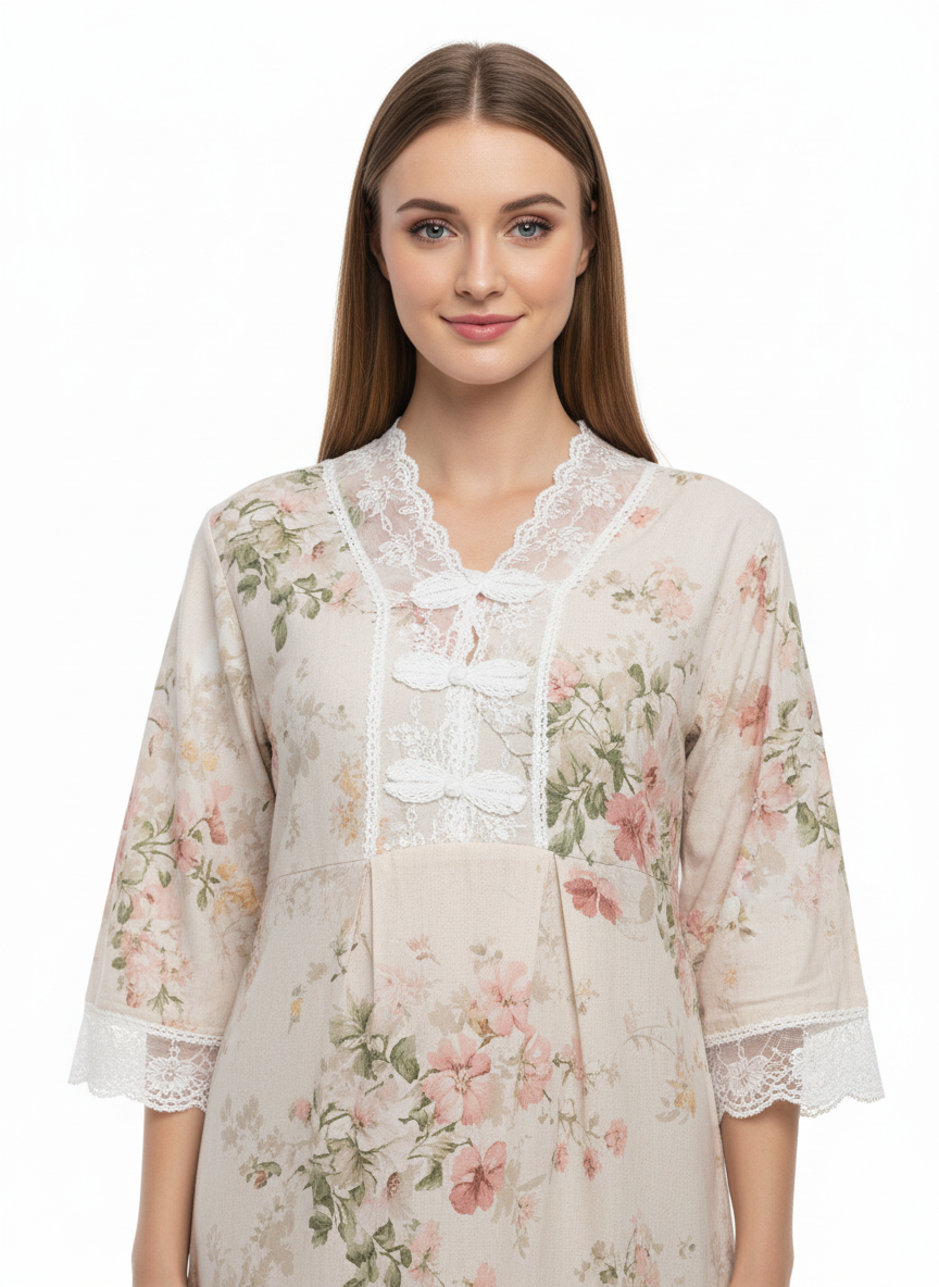 Product Description• Fabric: Soft premium Rayon • Design: Floral prints with elegant lace detailing on neck and sleeves• Fit: Perfect for daily wear • Sleeves: 3\4 with lays finish • Style: Suitable for all day comfort