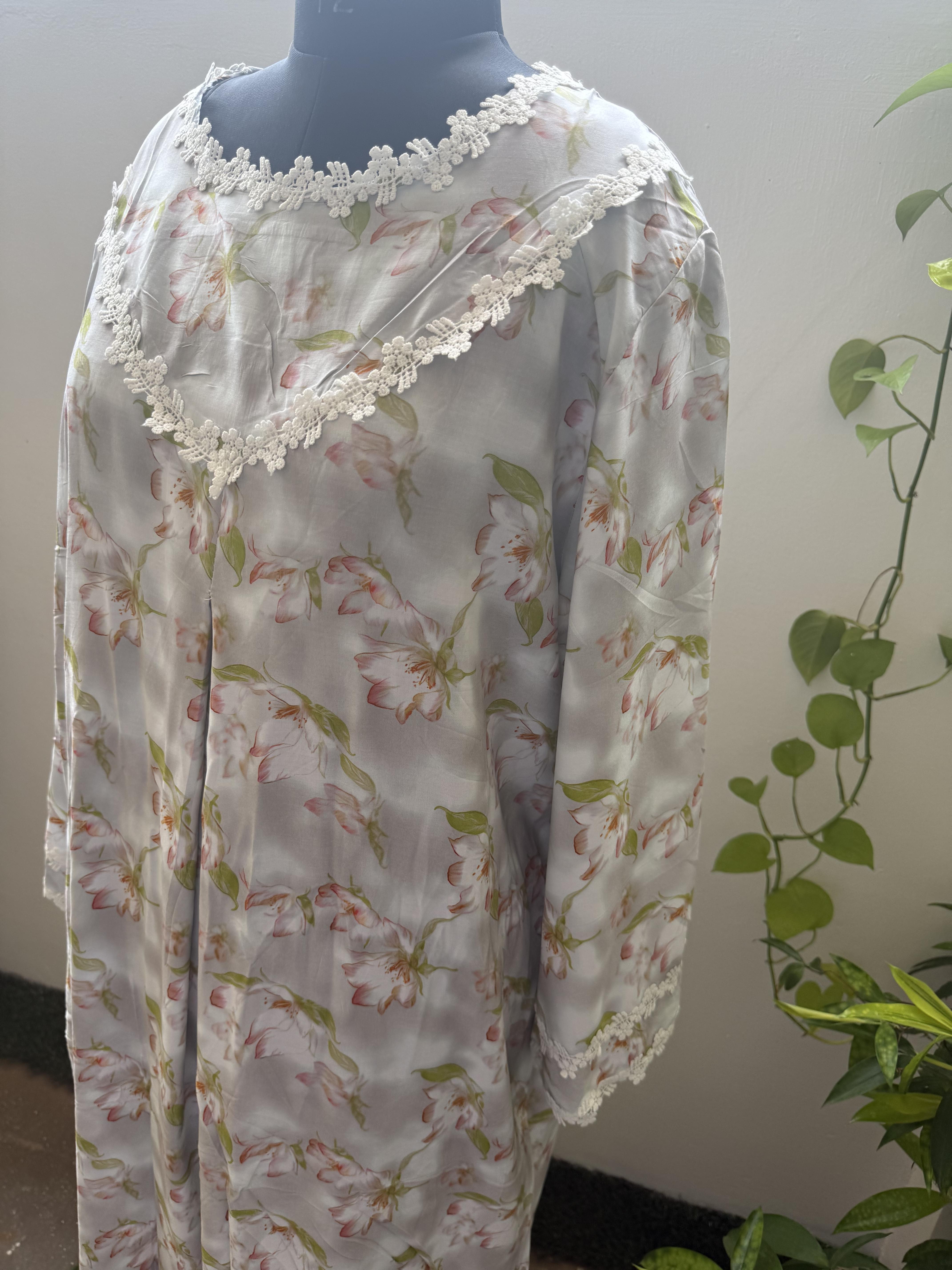 This elegant floral maxi is designed for everyday comfort with a relaxed and graceful look. The soft floral pattern and loose silhouette provide ease of movement, making it ideal for daily wear and home comfort.