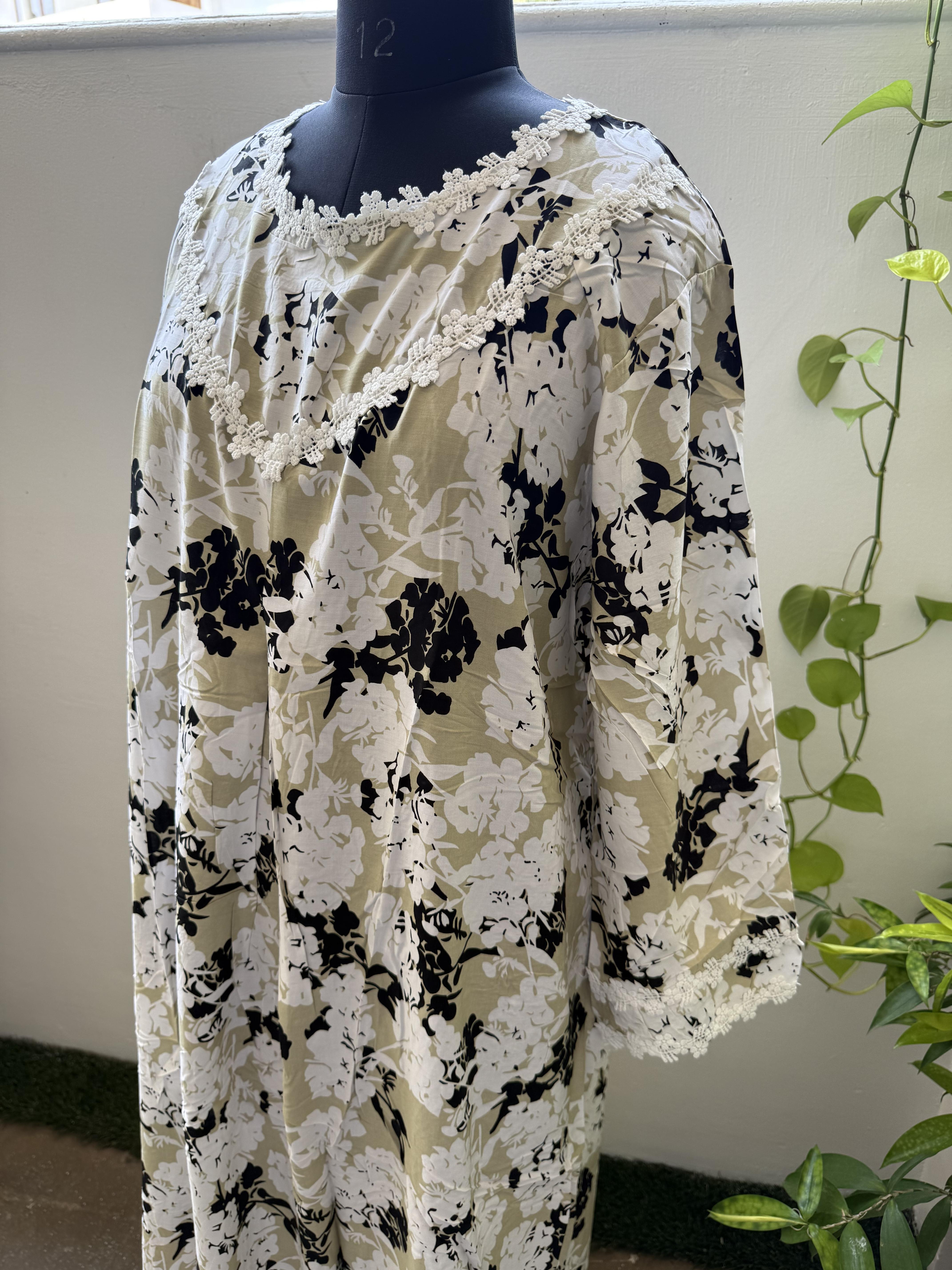 This elegant floral maxi is designed for everyday comfort with a relaxed and graceful look. The soft floral pattern and loose silhouette provide ease of movement, making it ideal for daily wear and home comfort.
